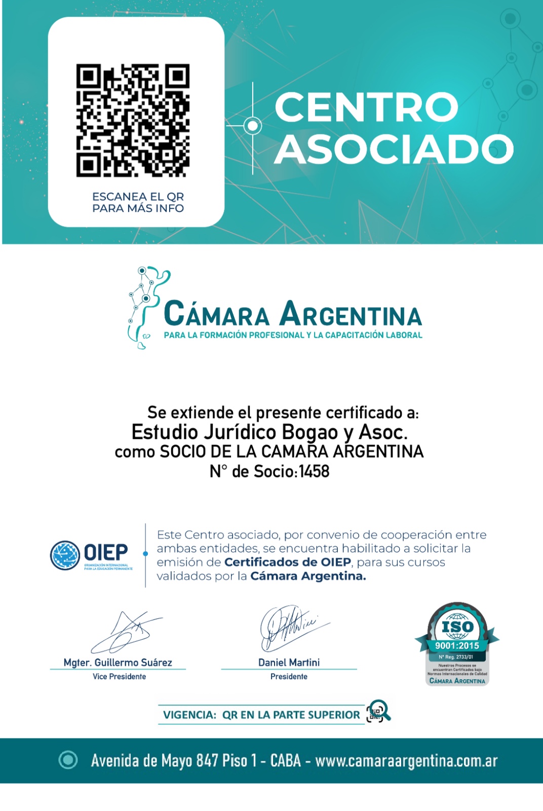 Todas nuestras capacitaciones cuentan con aval académico de la Cámara Argentina de Formación Profesional y de la OIEP – Organización Internacional de Estudios Profesionales, organismos reconocidos por su trayectoria en educación técnica, jurídica y profesional.